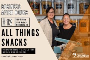 Please join us for an evening of food and fun as we celebrate the 1 Year Anniversary of All Things Snacks location in Middlebury! Be ready to sample snacks, network and experience the atmosphere.